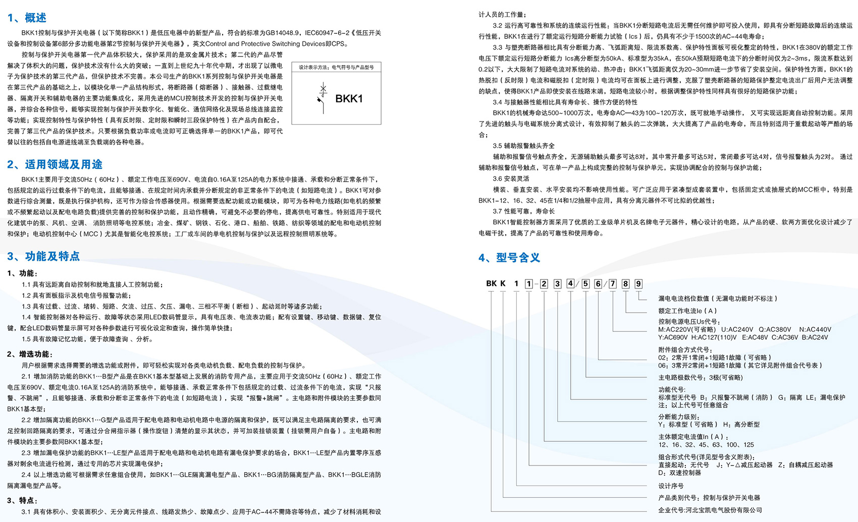 BKK1系列控制与保护开关电器主要用于交流50Hz(60Hz)、额定电压至690V、额定工作电流自0.4A至125A的电力系统中接通、承载和分断正常条件(包括规定的过载条件)下的电流,且能够接通、承载并分断规定的非正常条件(如短路)下的电流。BKK1系列采用模块化的单一产品结构形式,集成了传统的断路器(熔断器)、接触器、过载(或过流、断相)保护继电器、起动器、隔离器、电机综合保护器等多种传统的分离元器件。产品具有远距离自动控制与就地人力控制兼有的方式进行控制操作的功能,具有协调配合的时间-电流保护特性,具有控制与保护自配合、短路后连续运行,具有分断能力高,飞弧距离小、寿命长,具有保护整定电流均可调的特性,操作方便、配套模块多样齐全等优点,可以实现对电动机负载、配电负载的控制和保护。产品符合GB/T 14048.9《控制与保护开关电器》标准。